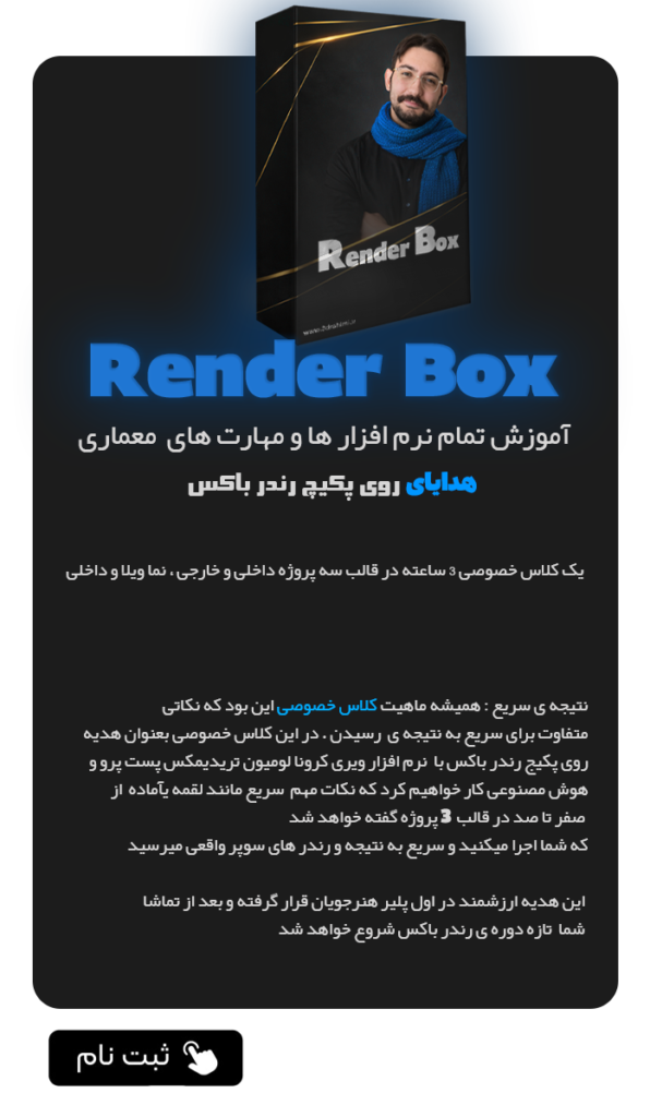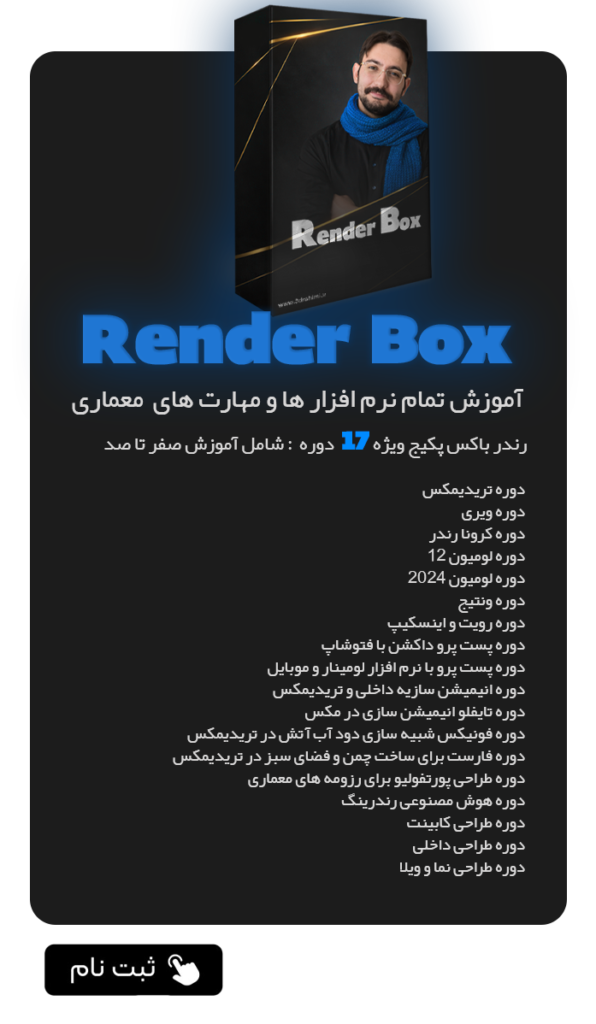 کامل ترین دوره ی اموزش نرم افزار های معماری تا موفقیت شما ، در کنارتون هستم کامل ترین دوره ی اموزش نرم افزار های معماری تا موفقیت شما ، در کنارتون هستم ۷۲۳۱ هنرجو ۱ اساتید ۴ دوره صحنه های پکیچ رندر باکس صحنه های پکیچ رندر باکس صحنه های پکیچ رندر باکس صحنه و پروژه های پکیچ رندر باکس قبلی بعدی سرفصل پکیج رندر باکس ( کلیک کن ) ۴ جلسه از دوره رندرباکس به صورت رایگان صحنه های پکیچ رندر باکس ویدیو توضیحات دوره ی رندر باکس صدا و نظر هنر جویان دوره رندر باکس